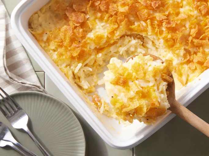 To make this 12-serving cheesy hashbrown casserole, gather the following ingredients: